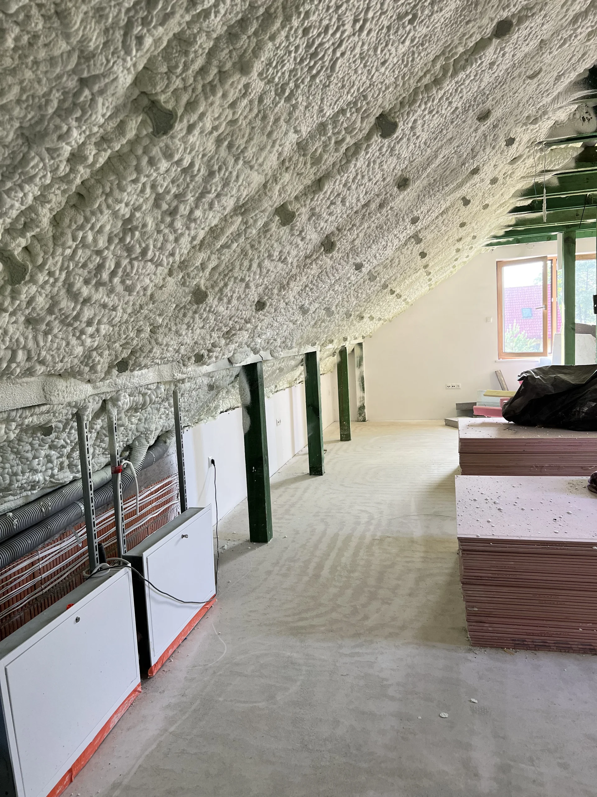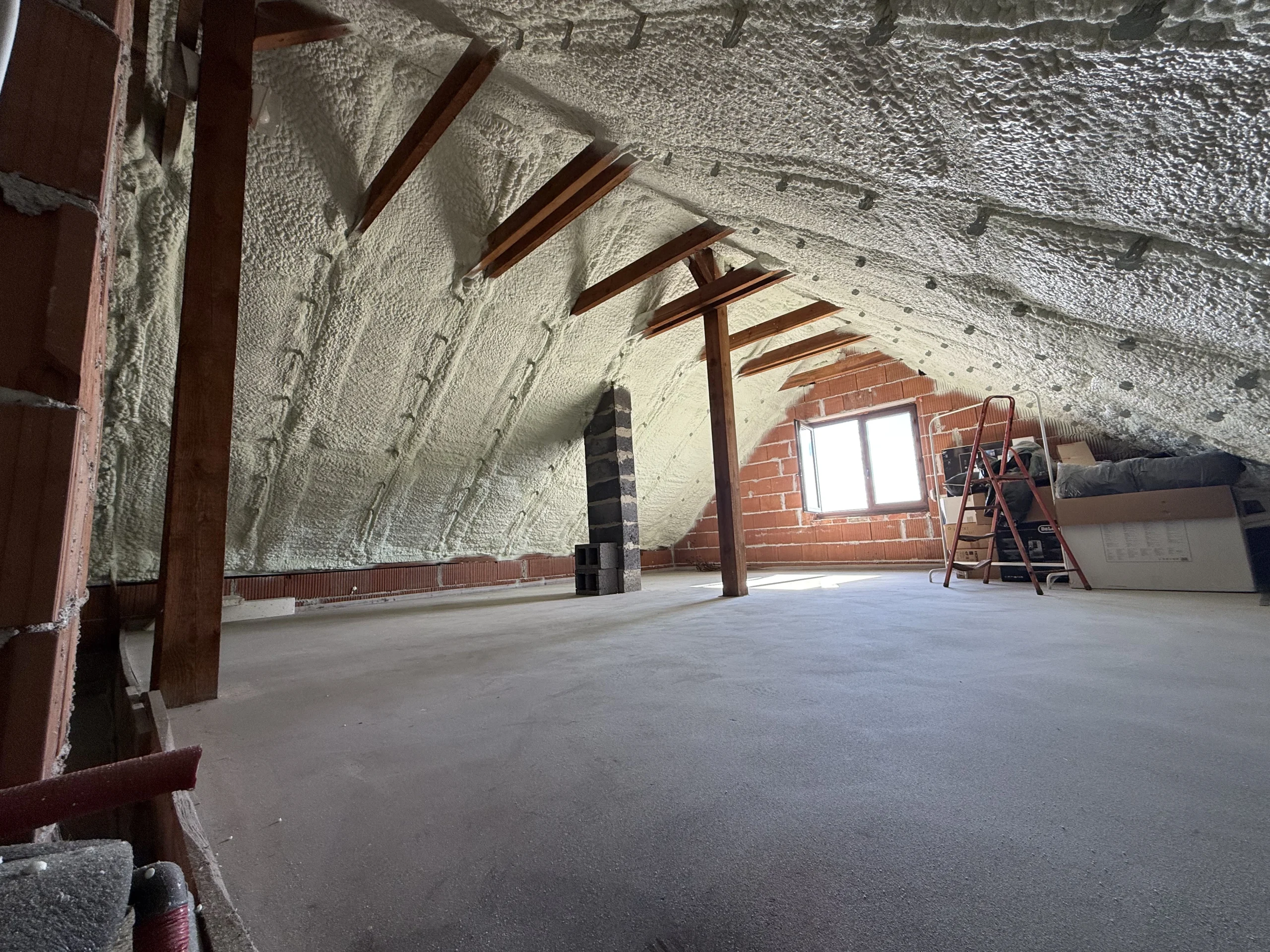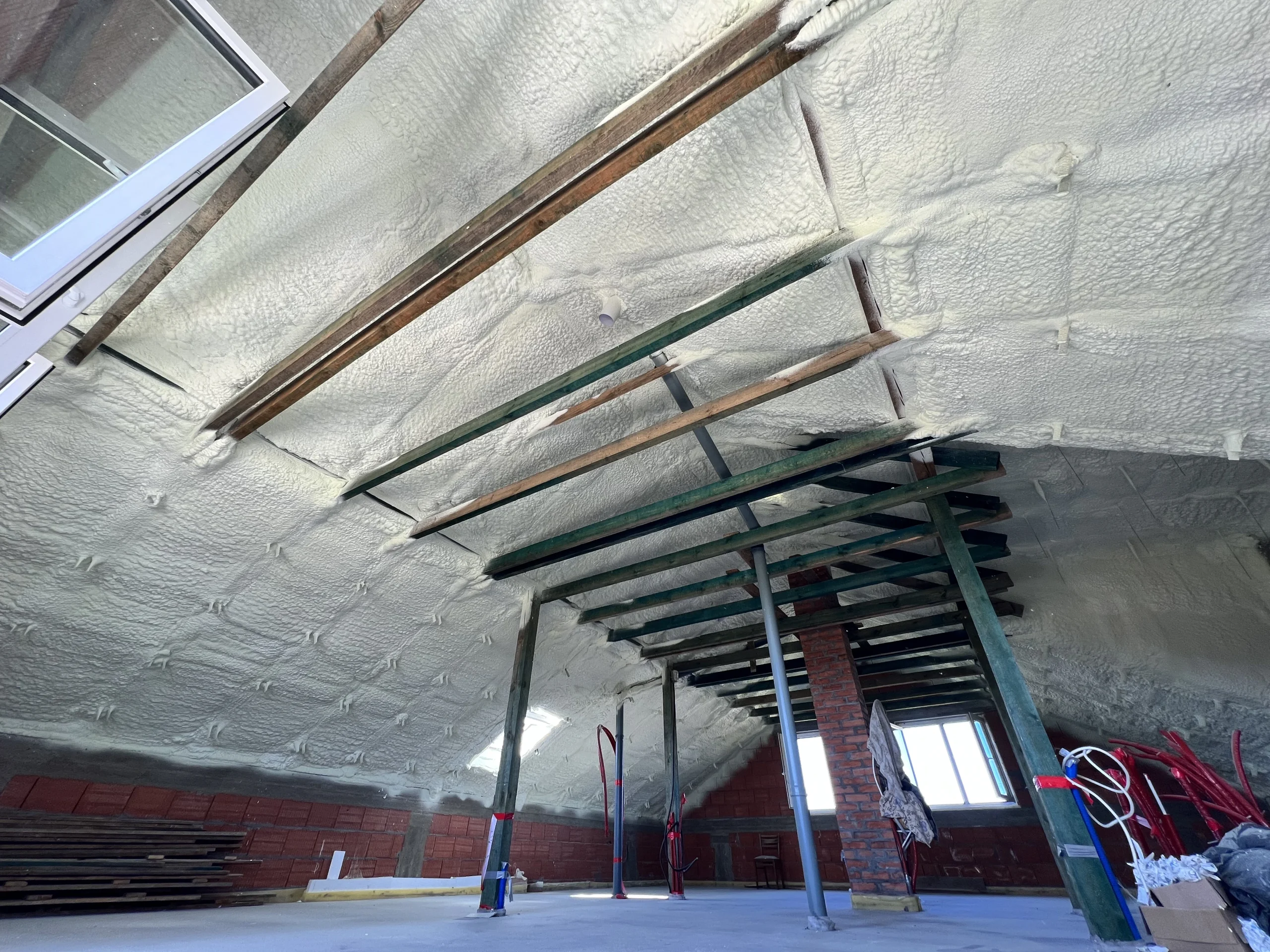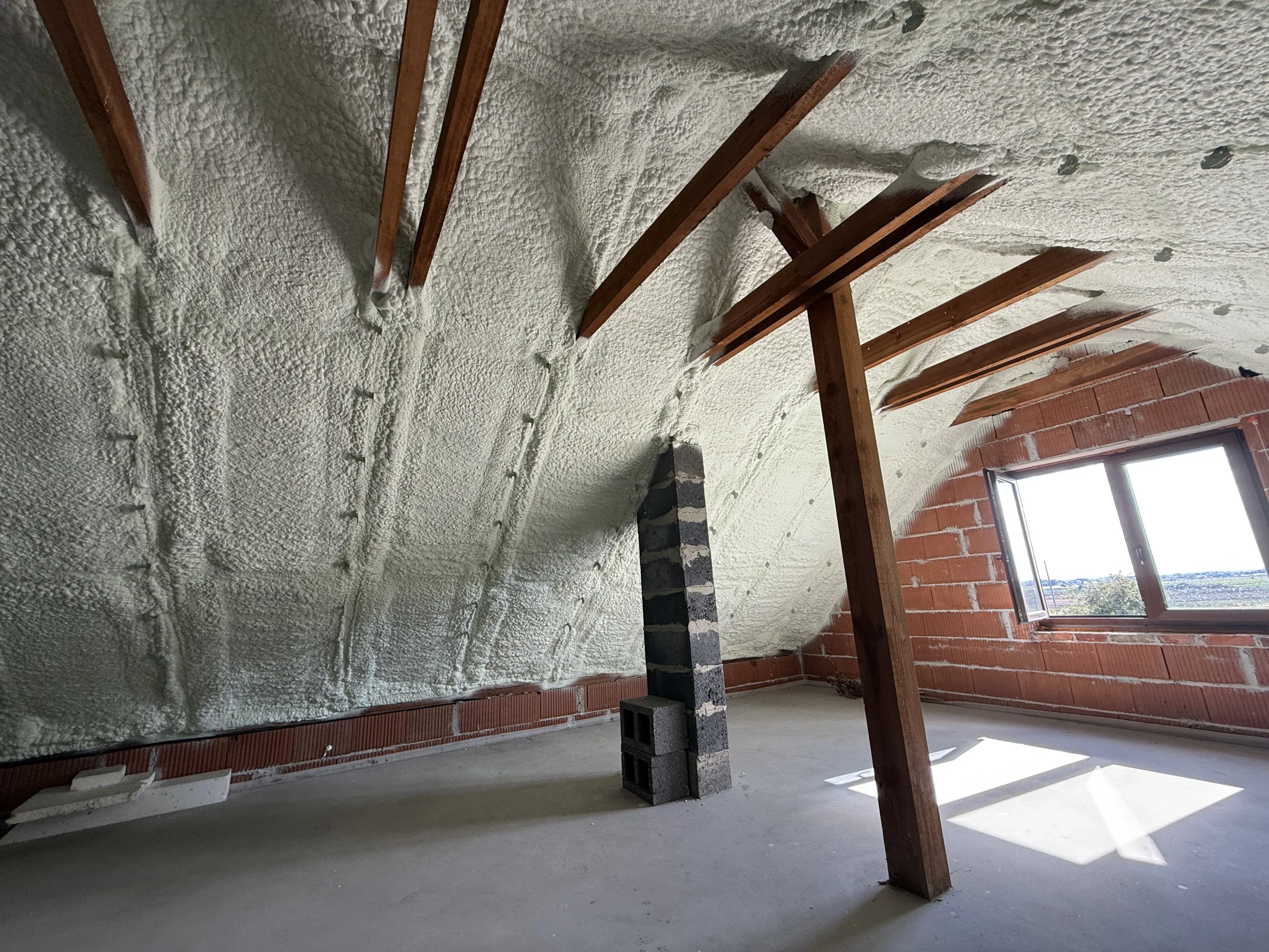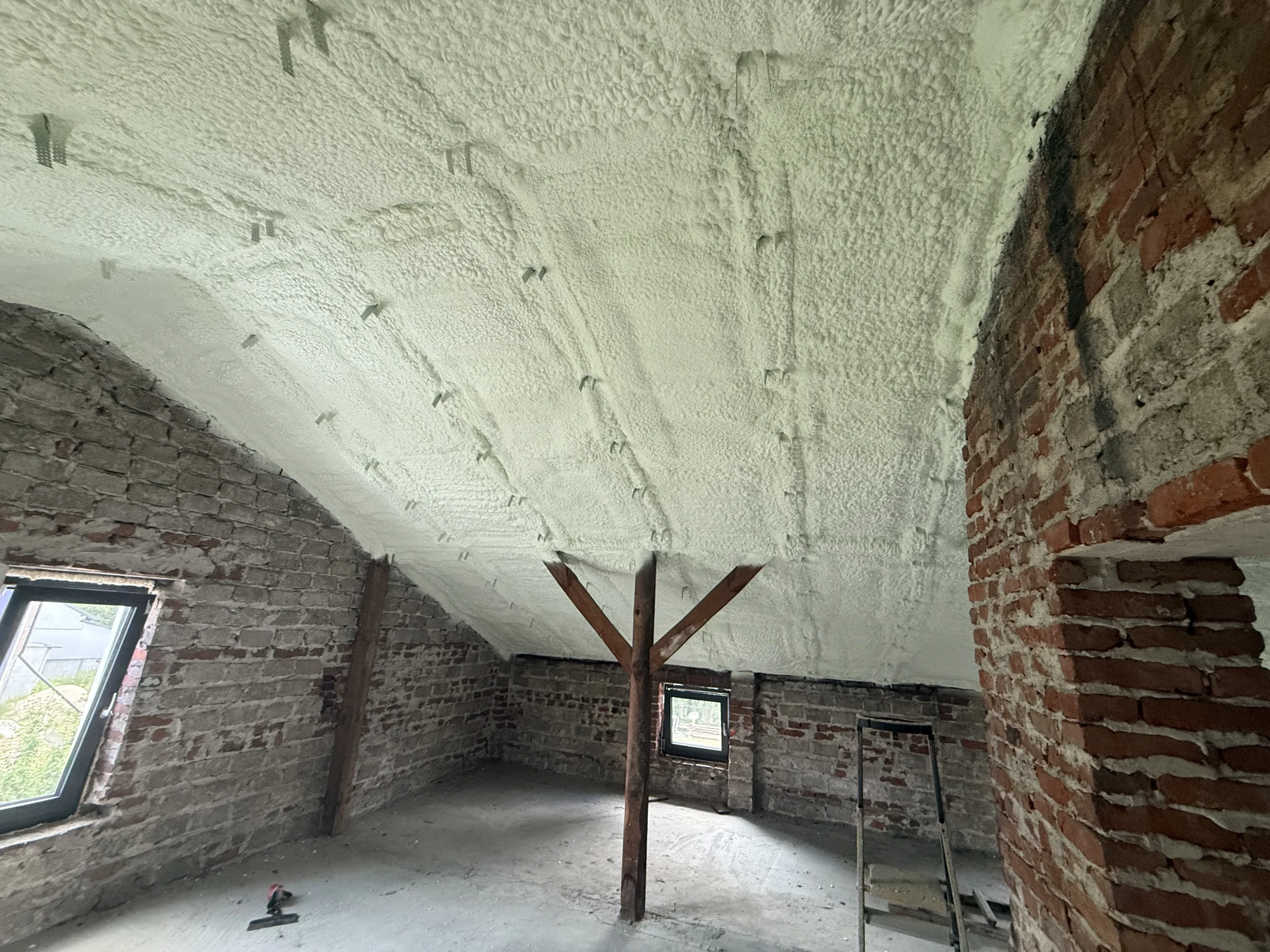 Piana PUR to trwała, lekka i szczelna izolacja, która poprawia komfort cieplny i akustyczny poddasza, redukując koszty ogrzewania. Dzięki natryskowi uzyskujemy ciągłą warstwę izolacji bez szczelin, idealną do konstrukcji drewnianych i skomplikowanych połaci.